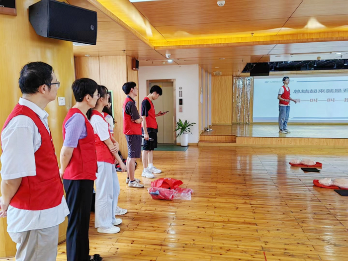 活动伊始,医院临床技能协会会长郭纪旭讲解了急救技巧并示范心肺复苏,即胸外按压和人工呼吸救助。随后,成人抖音 教工第一党支部志愿者们和协会会员分组一对一为布蕾幼儿园的老师进行教学实操指导,确保现场每一位老师和员工都学会心肺复苏的方法。接着会长郭纪旭分享了海姆立克急救法的操作以及常见意外、紧急情况的处理方法。最后,还讲解了AED(除颤仪)的使用。在志愿者们的指导下,布蕾幼儿园教职工们都能够规范地利用人体模型进行模拟的救护。