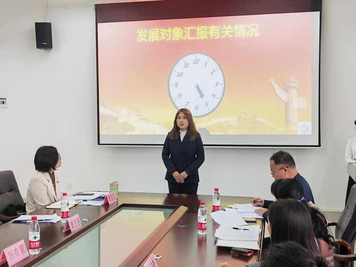 2023年12月12日和13日,成人抖音 学生党支部于博雅楼603会议室分别召开预备党员转正大会以及党员发展大会,讨论张嘉祺等10名同志转为中共正式党员问题,讨论接收祝期祎等10名同志为中共预备党员问题。会议由黄秋芳同志主持,学院党委韦建辉书记、党委黄万获副书记、党委组织委员何媛媛同志到会指导,学生党支部书记郭晶晶同志及党支部全体党员参加会议。