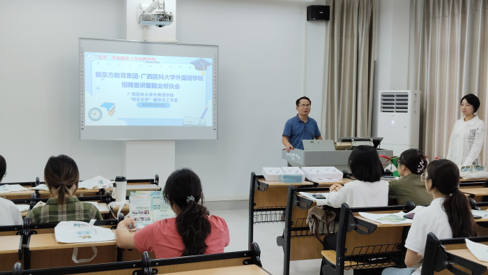 2025年10月15日,新东方教育集团下属机构-南宁市青秀区新东方文化艺术培训有限公司到学院开展宣讲招聘活动,系学院2026届毕业生首场专场宣讲招聘会。学院20多名毕业生参加活动。学院党委副书记黄万获主持宣讲招聘会并致欢迎辞。