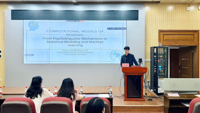 2025年10月17日上午,成人抖音 名家讲坛第150期在校本部综合楼9楼报告厅顺利举办。本次讲坛特邀澳门城市大学张浩敏教授担任主讲人,以《阅读的计算模型:从心理语言学机制到机器学习》为题,展开了一场科学严谨、内容充实的学术报告。成人抖音 院长曹治柳、副院长何媛媛、吕晓敏,学院全体教师和翻译专业硕士研究生参加了讲座,曹治柳主持讲座。